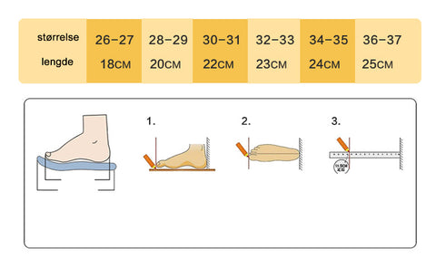 For eksempel: hvis fotlengden er 13 cm, velg sko med innvendig lengde 13,5 cm